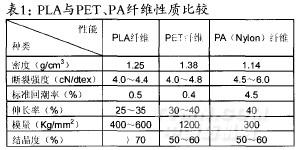 PLA纖維具有與滌綸相似的性能和真絲般的光澤,其回潮率和吸濕性都優于滌綸,因此PLA織物的舒適性較好(見表1)。它雖然不是阻燃纖維,但具有低可燃和低發炯量的性}的彈性回復性、卷曲保持性、手感椰懸主很好。所以PLA纖維可制成長絲、短纖、復和非織造布材料,廣泛用作醫療衛生產品,內、運動衣。家具裝飾布,人造草坪和土工布等。