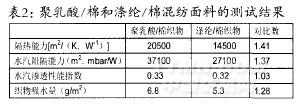 聚乳酸纖維/棉和滌綸/棉混紡面料的對比測試結果(見表2)。