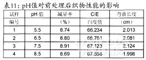 退煮漂一浴一步法前處理工藝條件:浴比1:30,時間35min,硅酸鈉5g/L,平平加一O0.5g/L,滲透劑B2g/L,酶用量5g/L,30%雙氧水用量8ml/L,溫度為80%,處理液pH值分別為5.5、6.5、7.5以及8.5,經處理后的織物性能見表11。