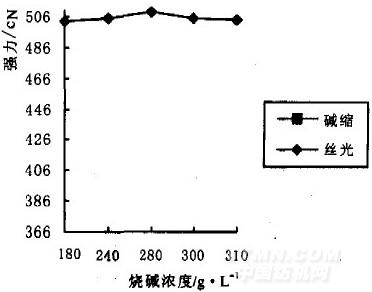 紗線絲光用自制絲光架做不同燒堿濃度、溫度、時間的雙絲光試驗,同時做無張力絲光(堿縮)進行對比。