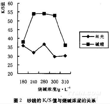 用8.5 teX燒毛紗線,燒堿,耐堿絲光滲透劑等;自制紗線絲光架,單紗強力儀,顯微鏡,測色儀等。紗線煮練按常規煮練工藝進行。用燒堿和耐堿絲光滲透劑配制不同濃度的絲光溶液此外,配制I2-KI溶液和1M的直接湖藍染液。