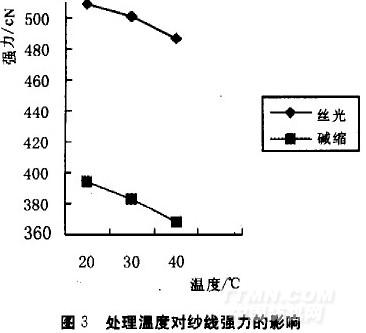 由圖1可知,當燒堿濃度由180 g/L變化到280 g/L時,雙絲光紗線的強力逐漸增加}由280 g/L變化到310 g/L時,強力則逐漸下降。這表明當燒堿濃度為280 g/L時,雙絲光后的紗線強力最大。而對于兩次堿縮的紗線,當燒堿濃度由180 g/L 變化到240 g/L時,強力逐漸增加}由240 g/L到280 g/L時,強力略有下降。但幾乎不變I當由280 g/L變化到310 g/L時,強力逐漸下降。這說明當燒堿濃度在240 g/L到280 g/L之間時,兩次堿縮的紗線強力最大。