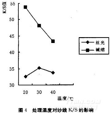 由圖1和圖2可知,無論是雙絲光還是兩次堿縮,燒堿的濃度都是在280 g/L時效果較好。同時還可看出雙絲光后的紗線強力比兩次堿縮后的紗線強力大,但K/S值卻小,即染色性能和吸附性能較差。這是因為絲光后的棉纖維因溶 脹,使大分子間的作用力遭到破壞,在張力的作用下,纖維大分子的排列趨于整齊,使取向度提高 當受到外力作用時,就能由更多的大分子均勻承擔,受力均勻。纖維因某個大分子斷裂的幾率降低,同時經膨化而重排的纖維相互緊貼,抱合力提高,消除或減小了 纖維因大分子滑移而發生斷裂的因素,所以強力得到提高。而堿縮紗線處理時沒有受到張力的作用,因而強力較小。