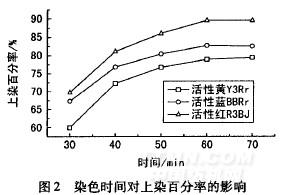 由圖1可以看出,隨著溫度的升高,染料的上染百分率均有所提高。這是因為麗賽纖維結構緊密,微隙小,染料難以通過。染色溫度的升高可以促進纖維表面軟化膨潤,促進活性染料的吸附、滲透與擴散,提高染料的上染率。三種中溫型活性染料在60℃時上染百分率已很高,溫度繼續升高,上染百分率只有較小幅度的提高,考慮到染料的性質和節省能源,因此選擇染色溫度60℃為佳。