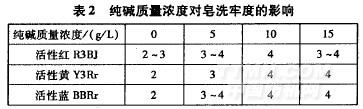 對不同純堿質量濃度的麗賽纖維染色后進行皂洗牢度測試,結果如表2。