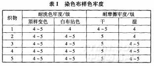 染后布樣色彩飽滿,布面均勻,手感豐滿,織物染色牢度見表1。