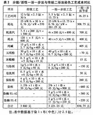 滌棉織物分散/活性一浴一步法工藝將加工時間從12h縮減為5.5h,大大節約水、電、汽,其與傳統二浴法工藝的成本對比見表2。