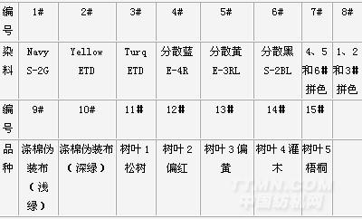 選用具有防近紅外偽裝功能的滌棉迷彩布及樹葉作為參比物,樣品及染料配方見表1所示。