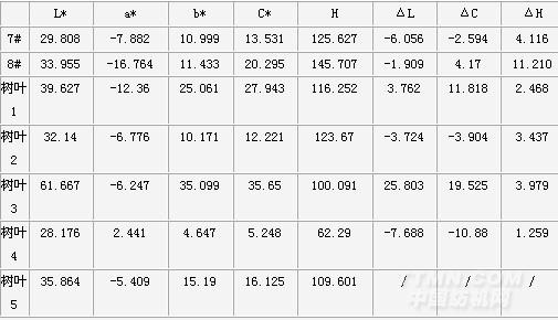 表2 樹葉與7、8#樣品CIELAB色差參數值