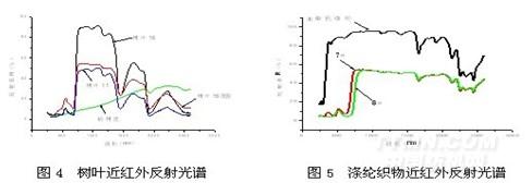 從圖4可以看出,不同樹葉在近紅外波段(700~2600nm)都具有非常相似的反射光譜,而且樹葉正、反面的反射光譜也是不相同的,這是因為樹葉中都含 有葉綠素成份,但樹葉正、反面結構有所不同。變化比較明顯的是在680~760nm,反射值急劇增大,不同樹葉的反射值大小有所不同,試樣11(樹葉1, 針樹葉)反射值約在45%左右,而試樣15(樹葉5,闊葉林)反射值卻高達85%,變化幅度在40~87%之間。760~1300nm反射曲線基本上沒有 大的變化,只在980nm和1187.5nm處有兩個不十分明顯的反射谷。此外,在1445nm和1930nm處有兩個明顯的反射谷,但不同樹葉吸收能力 也不相同。從圖4中還可以看出,樹皮的反射光譜與樹葉有著本質的區別(此處選用的是暗灰色楊樹皮),這是因為樹皮與樹葉構成不同。