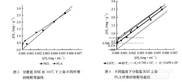 b)PI A纖維的染色熱力學研究表明,分散藍RSE上染聚乳酸纖維的吸附等溫線不完全服從Nernst分配型,而是Langmuir與Nernst的復合型;隨著溫度升高,Nernst型分配系數KN增大,Langmuir定位吸附飽和值Es]降低,更趨向于發生Nernst型分配機理。