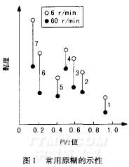 PVI值較大的糊料,在剪切速率發生變化時,黏度變化較小。因而,含有這類原糊的印花色漿,在印花車速變化時,黏度變化不大,可保持較為一致的印制效果。相反,PVI值較小的原糊,隨印花車速變化,黏度變化顯著,印制效果不易控制,此時必須適當提高糊料的含固量。