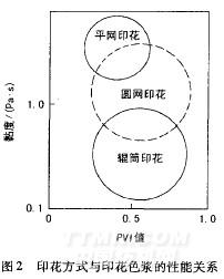 平網印花和輥筒印花的剪切應力不同,因而對印花色漿的流變性要求也不一樣。用于平網印花的色漿并不一定適用于輥筒印花。對常用印花色漿進行測試發現,示性圖不同的黏度指數PVI值,適合不同的印花方式,如圖2所示: