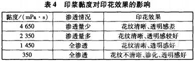 透明印花漿FS417s的黏度,是影響色漿滲透性和上漿量的主要因素。水溶性醇類等溶劑可以降低FS_417s的黏度,促進(jìn)透明印花漿的滲透,提高透明度。但黏度過(guò)低會(huì)造成印制圖案滲化,降低一等品率。增稠劑Fs-200是印花漿FS417s專用增稠劑,可在不影響透明效果的前提下提高印漿黏度。根據(jù)不同織物的特點(diǎn),將Fs4l7S調(diào)至適當(dāng)黏度,才能達(dá)到最佳的透明印花效果(表4)。