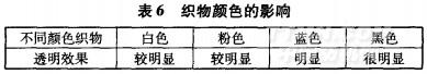 采用FS4l7S,以相同的印花工藝(平網(wǎng)印花)在不同顏色的織物上印花,發(fā)現(xiàn)透明效果有一定差異。色澤深的織物透明效果較白色織物好,特別是黑色織物經(jīng)堿縮后,起縐透明感更強(qiáng),透明效果更好。這是由于深色織物與白光(太陽(yáng)光)對(duì)比度大,印制后的圖案與基布差異明顯,透明效果更加明顯(表6)。