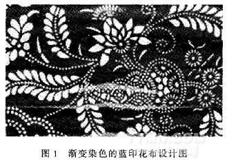 在藍印花布染色過程中,有意識地在原有浸染工藝的基礎(chǔ)上結(jié)合漸染、段染、潑染等技術(shù)手段,在色地上造成色彩的偶然性差異,如深淺變化、肌理變化、色塊輪廓變化甚至是套色效果。漸變?nèi)旧乃{印花布見圖l,體現(xiàn)偶發(fā)性色彩生動隨意的優(yōu)點,符合當(dāng)代紡織品市場的色彩流行趨勢。