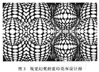 相對中國傳統圖案悠久的歷史,藍印花布的成長和成熟期比較晚,明顯借鑒傳統吉祥圖案的敘事、象征題材,但在當代紡織品設計中,圖形的象征意義正在減弱。藍印花布圖案創新有必要嫁接新的題材,迎合流行審美需要。幾何圖案是現代設計中的典型元素,體現了現代工藝的簡潔特征,通過計算機成形和激光切割,把傳統手工無法企及的平面幾何構成精確地運用到紙版設計上,可以設計出具有歐普藝術風格的視覺幻覺的藍印花布,見圖3。