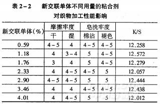 如表2—2所示,選擇新交聯型單體用量為單體總質量2.9o%時,使用該粘合劑制成的印花糊,加工織物的摩擦牢度和皂洗牢度都優良于其它,K/S值也比其它高。故采用此用量交聯單體可以獲得很好的印花織物粘合劑。