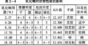 過多的乳化糊首先在調漿時發生困難,色漿很稠,攪勻困難。在印花的時候較稠的印花色漿無法順利通過網孔,導致織物印色不勻,整理過的織物手感也很差。由表2—4可以確定,選擇乳化糊的用量為總色漿質量的4.26%。