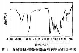 如前所述,本試驗(yàn)自制的聚醚/聚酯(非離子)耐久型滌綸織物親水抗靜電劑PEE,是聚對(duì)苯二甲酸乙二酯和聚對(duì)苯二甲酸聚乙二醇酯(包含聚醚鏈段)的嵌段共聚物,其紅外光譜見(jiàn)圖1。