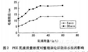 選取不同質(zhì)量濃度的PEE乳液,采用浸軋法處理滌綸織物,焙烘溫度150℃,焙烘時(shí)間60S,測(cè)定處理滌綸織物的毛細(xì)效應(yīng),結(jié)果如圖2。