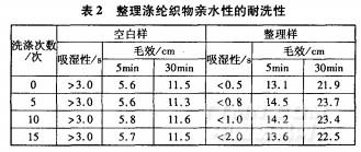 從表2看出,經(jīng)過(guò)l5次洗滌,處理滌綸織物仍表現(xiàn)較好的親水性,表明整理劑具有較好的耐洗性。