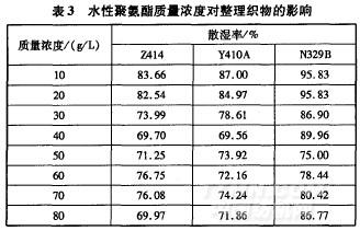 表3為不同質量濃度水性聚氨酯工作液對棉蓋滌針織物散濕率的影響。