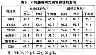 從表6可知,棉蓋滌針織物經整理后,除整理劑1外,其余都能使織物的彈性提高;相比之下,Y410A和整理劑2整理后的織物彈性較好。