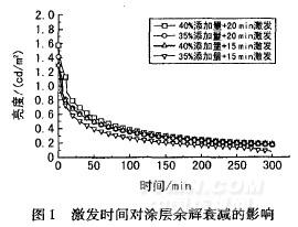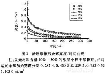 (1)夜光涂層余輝初始發光亮度隨發光材料添加量的增加而增大,但增加到一定程度,在相同的激發條件下,亮度趨于平緩。
