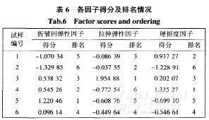 本文采用回歸分析方法,對實驗試樣的硬挺度因子、拉伸彈性因子和折皺回彈性因子得分進行排名,結(jié)果如表6所示,期望值設(shè)置為0,方差設(shè)置為1.