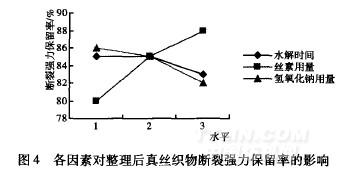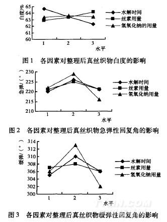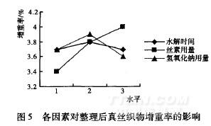 (3)氫氧化鈉用量C對各指標的影響:隨著氫氧化鈉用量的增加,白度基本保持不變,急彈與緩彈先增后減,斷裂強力隨之減小,增重率先增后減。結合表3分析,對急彈、緩彈回復率,氫氧化鈉用量的影響最大,取水平2最好;對斷裂強力來說,氫氧化鈉用量影響適中,可取水平1。氫氧化鈉用量對白度、增重率的影響最小,取水平2。隨著NaOH質量一體積分數的增加,被整理織物的急彈和緩彈先增大后減小。當NaOH為3g/L時,織物的折皺回復角最大,超過3g/L時折皺回復角開始減小。這是因為NaOH的質量一體積分數過大時,絲素水解加快,絲素分子量過小,浸軋時與蠶絲纖維的吸引力減小,能附著在纖維上的絲素分子減少,經過焙烘與纖維發生的交聯也大大減少。而在NaOH質量一體積分數適宜的情況下,絲素分子被分解成的多肽分子的大小也適宜,這不僅有利于滲透到蠶絲內部的空隙中,均勻分布于織物內,焙烘后更有利于交聯。綜合各項因素,NaOH質量一體積分數以3g/L為宜。綜合考慮,氫氧化鈉用量取水平2,即3g/L為好。