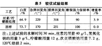 經A2B3C2較優工藝整理后的真絲織物與未處理的性能對比如表5。當絲素整理劑和檸檬酸復合整理時,它能在纖維和整理劑之間形成一定的交聯,提高真絲織物抗皺性的同時,有效地保持其斷裂強力和白度。