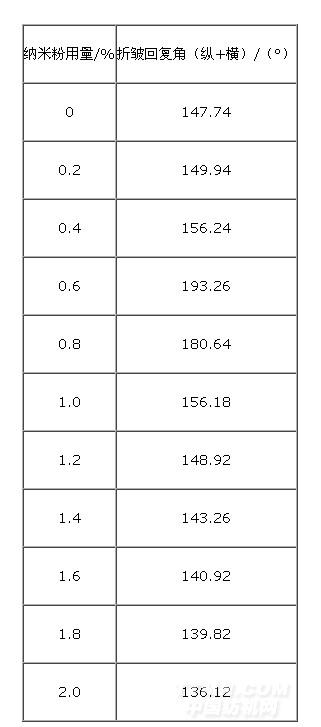 張瑞萍等[3]采用納米氧化鋅和水溶性聚氨酯作用于真絲織物,折皺回復角由200.3°提高到285.2°,整理中用到納米整理劑0.5%;趙海洋等[4]探討了納米二氧化鈦的加入量對純棉平紋、斜紋織物抗皺整理效果的影響,當納米二氧化鈦的濃度為0.1 g/L時,效果較好。有關納米技術在織物抗皺整理中的應用已有研究,基于他人的研究,選擇納米材料的用量。因為納米材料的用量太大會影響到織物手感和風格,所以納米粉的用量初選在0.2%~2.0%。測試不同比例納米粉的純棉針織物折皺回復角(縱+橫),結果如表1所示。