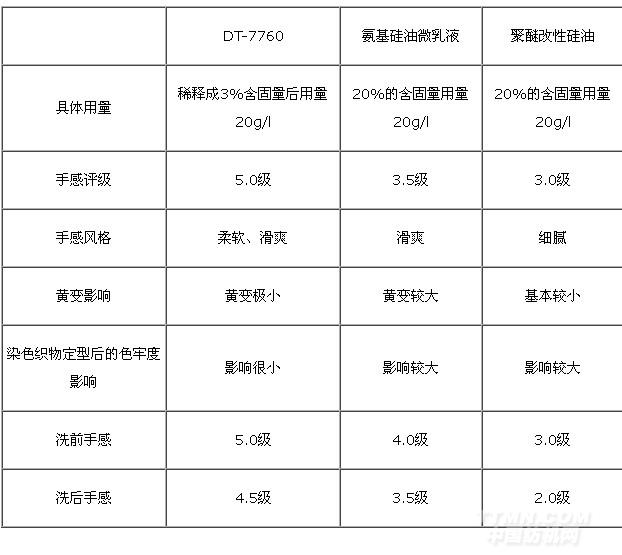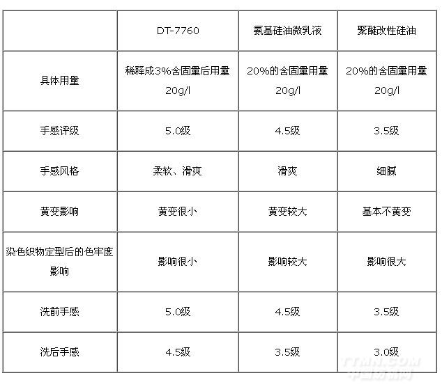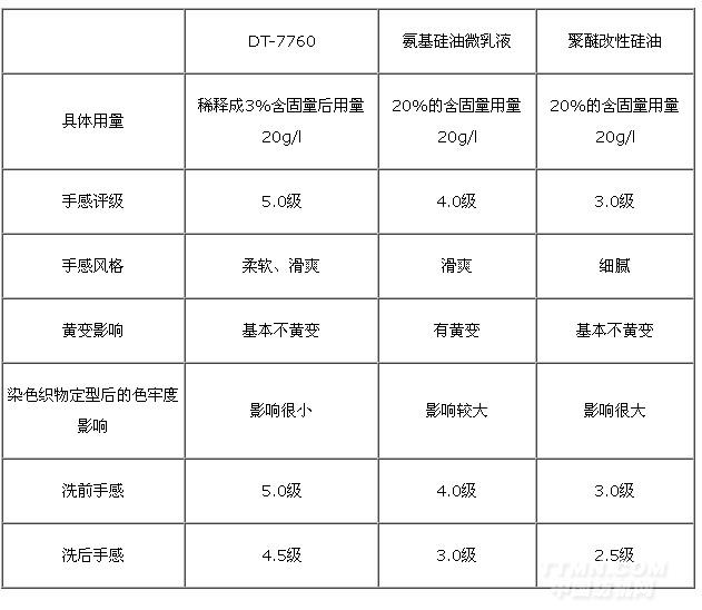 分析上述數(shù)據(jù)可以看到,DT-7760用在珊瑚絨、純滌、滌棉上的手感遠(yuǎn)超過(guò)氨基硅乳液的手感,基本不黃變,對(duì)染色織物定型后的色牢度影響很小。并且具有優(yōu)異的耐洗性能。