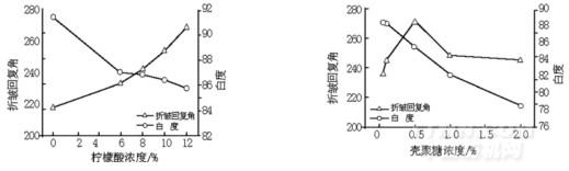 次亞磷酸鈉是一種較好的催化劑。圖3所示,當次亞磷酸鈉為6%時,折皺回復角和白度都較好。這是因為催化劑促進了纖維素羥基與羧酸的酯交聯而使彈性上升,次亞磷酸鈉同時也是一種弱還原劑,可以抑制檸檬酸分子內脫水而使白度提高[5]。