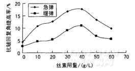由圖1可看出,真絲經絲素整理后,其折皺回復角隨絲素用量的增大而提高。這是由于檸檬酸為多元羧酸,能和絲素以及真絲織物中的羥基、氨基等發生反應,形成絲素、檸檬酸、真絲間的網狀結構。隨著絲素整理劑用量的增加,纖維內的共價交聯不斷增多,因此,真絲織物的折皺回復性提高。絲素用量超過40g/L時,其急彈和緩彈折皺回復性有所下降,這是由于絲素用量過高,整理劑黏度過大,大部分絲素分子只能附著在纖維表面[4],不利于絲素、真絲和檸檬酸間的交聯反應,造成折皺回復性下降,織物手感變硬。因此,確定絲素用量為40g/L。