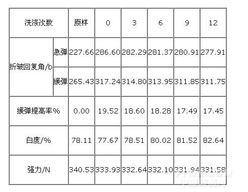 整理后織物折皺回復(fù)角增加,強(qiáng)力和白度下降不明顯。隨著洗滌次數(shù)的增加,折皺回復(fù)角值雖有降低,但仍比原樣高得多,說(shuō)明經(jīng)過(guò)高溫焙烘后,絲素、檸檬酸在蠶絲織物上的固著比較穩(wěn)定,具有較好的耐洗性能。