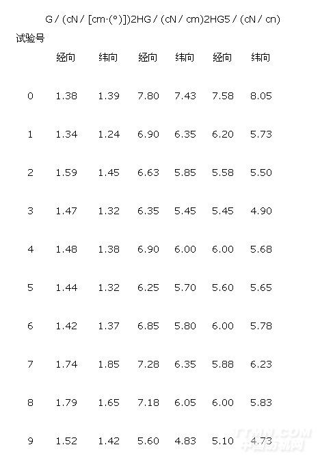 測試織物剪切性能,包括剪切剛度(G),0.5下剪切滯后力(2HG)和5°下的剪切滯后力(2HG5)。測試結果見表8。