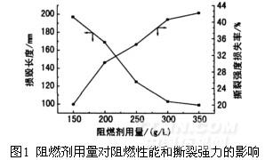 阻燃劑用量是決定阻燃效果的重要因素,阻燃劑用量對(duì)純棉織物阻燃性能和撕裂強(qiáng)力的影響見圖1。