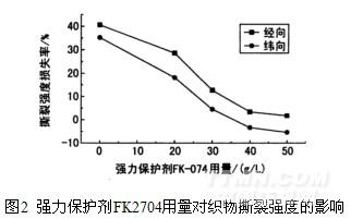 隨著強(qiáng)力保護(hù)劑FK2074用量增加,織物經(jīng)緯向的撕裂強(qiáng)度損失率降低。當(dāng)強(qiáng)力保護(hù)劑用量為40 g/L時(shí),經(jīng)向撕裂強(qiáng)度接近原布,而緯向撕裂強(qiáng)度則高于原布。