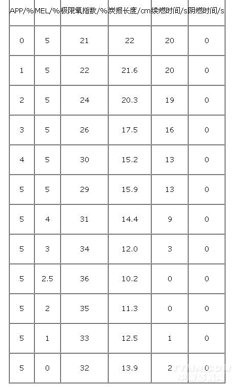 由表1看出,阻燃劑APP用量為5%時,整理后亞麻織物具有較好的阻燃性,阻燃效果基本達到國家標準的B1級。另外,在阻燃劑APP中加入適量的MEL,可提高亞麻織物的阻燃性。試驗表明,APP與MEL的優化配比為2:1,炭損長度為10.2 cm,且離火即熄。