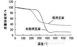 (2)常溫下,阻燃亞麻纖維表面被阻燃劑所覆蓋:200℃左右時阻燃劑開始分解,700℃時亞麻織物的質量保留率為35%。阻燃亞麻織物的起始失重溫度、最大失重速率溫度均低于未阻燃整理織物,但其質量保留率遠高于后者。