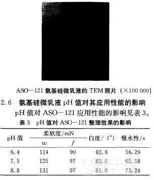 固體質量分數為25%或30%,pH值為6~ASO一121微乳液整理織物的柔軟性、白吸濕性較好。