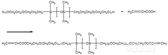 在裝有攪拌漿、分水器、氮氣充入裝置的干燥四口燒瓶中,依次加入與丙烯酸摩爾比為1:2的雙端羥基封端聚醚硅油和一定量的甲苯及對苯二酚,在氮氣保護下油浴升溫至一定溫度后,加入對甲基苯磺酸、丙烯酸(AA),維持在一定溫度,定時測定酸值。保溫若干小時,待酸值不再明顯變化,停止反應。反應結束后先減壓蒸餾除去溶劑和未反應的丙烯酸,80然后降至室溫過濾,最后得到淡黃色澄清透明產物。化學反應方程式如下: