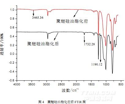 由圖4可知,聚醚硅油酯化前的紅外譜圖中,1061.6cm-1、1028.3cm-1180為聚醚硅油Si-O-Si的特征峰,1260cm-1、804.3cm-1為聚醚硅油Si-CH3的特征峰,3465.3cm-1為聚醚硅油—OH的特征峰。與酯化前聚醚硅油的紅外譜圖對比,酯化后聚醚硅油的紅外譜圖中,歸屬為聚醚硅油Si-O-Si的特征峰1061.6cm-1、1028.3cm-1均存在。但歸屬為聚醚硅油的—OH的特征峰3465.3cm-1在酯化后已經消失,并在1732.2cm-1出現了—C=O的特征峰以及在1190.1cm-1出現了—C-O-C的特征峰,表明酯化產物中有酯鍵生成。酯化產物在1600-1650cm-1未出現雙鍵特征峰,原因可能是雙鍵所占整個硅油的比例太低,吸收峰太弱不明顯所致。產物的紅外譜圖分析表明丙烯酸通過酯鍵接枝到聚醚硅油。