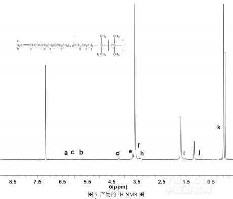 聚醚硅油酯化產物主要質子的核磁譜圖結果如圖5所示,其中分子鏈中各個質子振動峰對應的具體化學位移(δ)如下:k(0.08),Si-CH3;j(1.2),Si-CH2;i(1.71),Si-CH2CH*2CH2O;h(3.37),Si-CH2CH2CH*2O;f(3.54),-(CH2CH2O)-;e(3.65),CH*2CH2OOCCH=CH2;d(4.32),CH*2OOCCH=CH2;c(6.05),CH*=CH2;a(5.80)、b(6.43),CH=CH*2;7.25為CDCl3溶劑峰。這些峰說明合成產物分子中不僅含有骨架聚硅氧烷鏈段,還含有酯基、聚醚、乙烯基等基團,并且產物的結構基本與設計式結構一致。