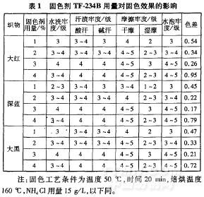 選擇三種顏色較深、牢度較差的棉針織物作為研究對(duì)象,考察固色劑TF一234B的用量對(duì)固色效果的影響,結(jié)果見(jiàn)表1。