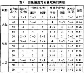 使用固色劑TF-234B3%(owf),在不同溫度條件下對(duì)所選染色織物固色20min,以考察固色溫度對(duì)固色效果的影響,結(jié)果見(jiàn)表2。