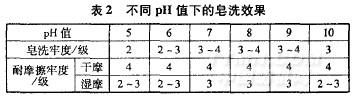 取JY一1103D用量lL,皂洗溫度7O℃,時間20min,浴比1:15,取不同pH值下的皂洗效果見表2。
