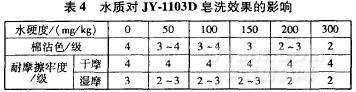 取JY一1103D用量為1g/L,皂洗溫度7O℃,時間20arin,浴比1:15,不同硬度水中的皂洗效果見表4。